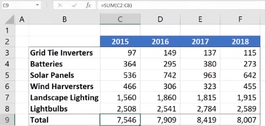 - [x] The AutoSum formulas include the year at the top of each column in the calculation.