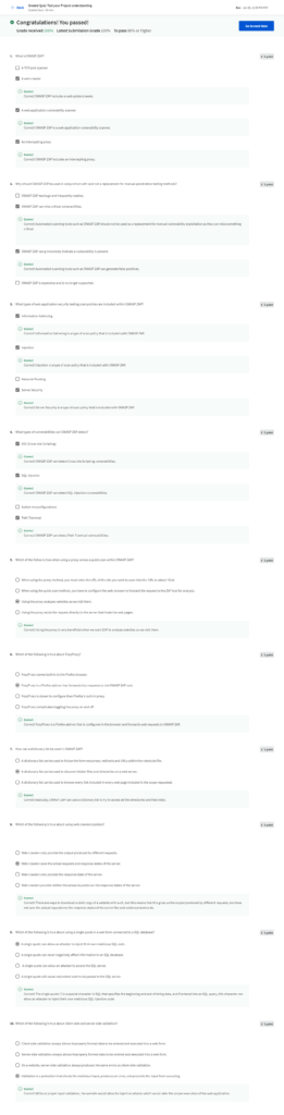 Home Free Courses Web Application Security Testing with OWASP ZAP Coursera Answers Free Courses Web Application Security Testing with OWASP ZAP Coursera Answers By Michael Kaiser - January 18, 2023 774 0 FacebookWhatsAppLinkedinEmailPrint RELATED ARTICLESMORE FROM AUTHOR Free Courses Free Microsoft cloud security trainings – new year, new goals! Free Courses Microsoft Azure Connected Learning Experience (CLX) Free Courses FREE REGISTRATION COURSE NETACAD LEAVE A REPLY Cancel reply Please enter your comment! Please enter your name here You have entered an incorrect email address! Please enter your email address here Save my name, email, and website in this browser for the next time I comment. {{#message}}{{{message}}}{{/message}}{{^message}}Your submission failed. The server responded with {{status_text}} (code {{status_code}}). Please contact the developer of this form processor to improve this message. Learn More{{/message}}{{#message}}{{{message}}}{{/message}}{{^message}}It appears your submission was successful. Even though the server responded OK, it is possible the submission was not processed. Please contact the developer of this form processor to improve this message. Learn More{{/message}}Submitting… MOST POPULAR ANSWERS LinkedIn Skill Assessment – MATLAB Michael Kaiser - July 17, 2022 Firewall Quiz Answers NSE 2 Information Security Awareness Fortinet Kevin Shaw - October 2, 2020 Information Security Associate Exam Answers – SkillFront Exam Answers Kevin Shaw - February 17, 2021 IBM Center for Cloud Training Free Michael Kaiser - October 26, 2022 PRINCE 2 Foundation – Exam 2022 Michael Kaiser - September 24, 2022